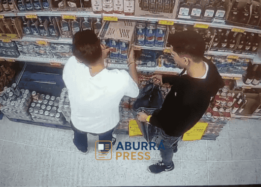 En las imágenes de las cámaras de seguridad se observa a dos hombres que ingresan al establecimiento y, al parecer, aprovechan la ausencia de personal de seguridad para tomar varias botellas de licor y salir del lugar sin pagar.