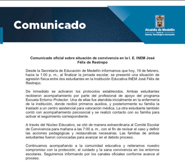 📍 Medellín, Antioquia | La Secretaría de Educación de Medellín confirmó que este miércoles 19 de febrero, hacia la 1:00 de la tarde, al finalizar la jornada escolar, se presentó una situación de presunta agresión física entre dos estudiantes en la Institución Educativa INEM José Félix de Restrepo, ubicada en Medellín.