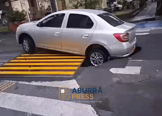 📍Medellín, Antioquia | Un vehículo particular terminó atrapado en un enorme hueco en este sector del occidente de Medellín, luego de que la lámina metálica que cubría la excavación se desplazara al momento de su paso.